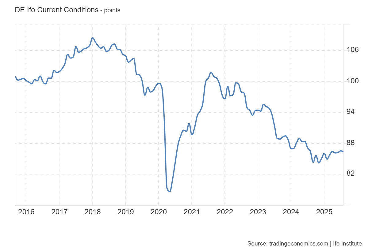 Összességében az Ifo Current Conditions indexének elmúlt évekbeli alakulása azt mutatja, hogy a német gazdaság a válságok sokaságára nem képes gyors, tartós választ adni. A jelenlegi üzleti helyzet mutató egyértelműen mutatja, hogy a vállalatok érzékelik a működési környezet tartósan nehéz voltát. A bizalom hiánya, a strukturális átalakulás nehézségei és a külső sokkok nyomása együtt egy olyan korszakot jeleznek, amelyben Németország már nem Európa motorja, hanem inkább egy sártengerben araszoló lovasszekér.
