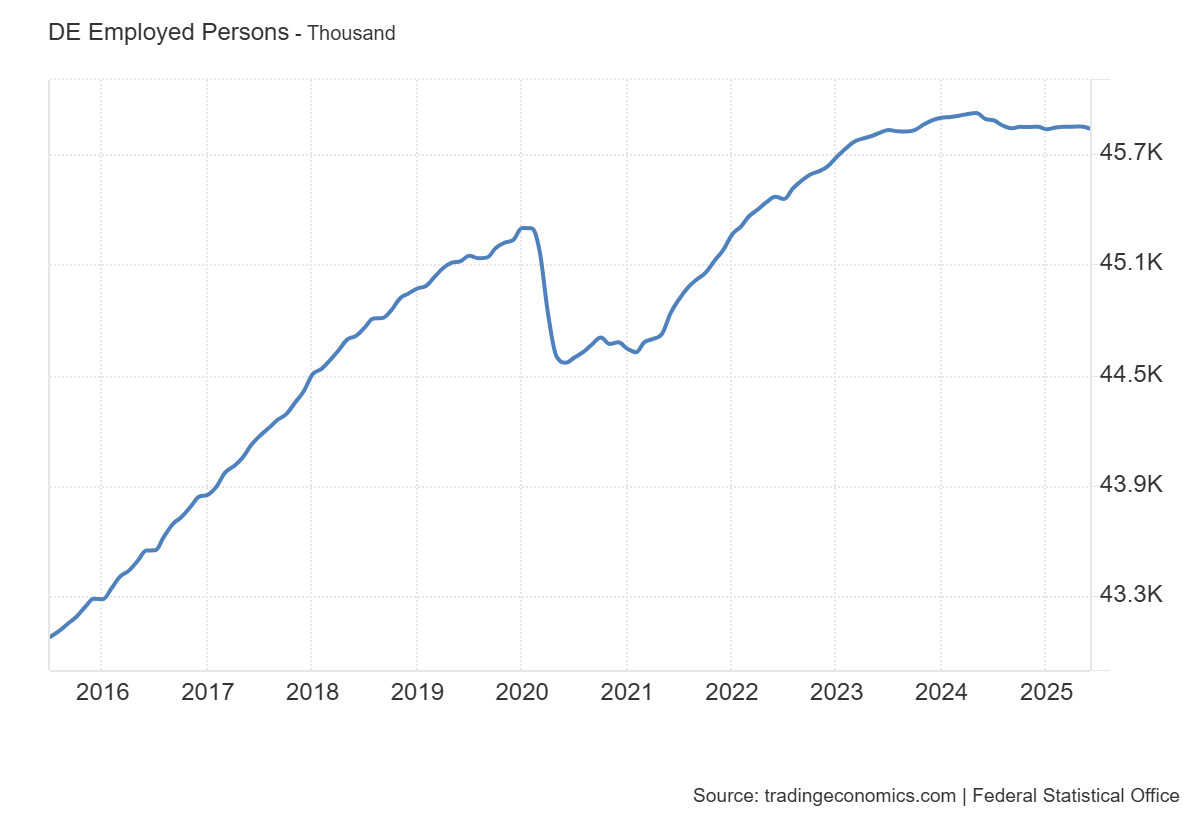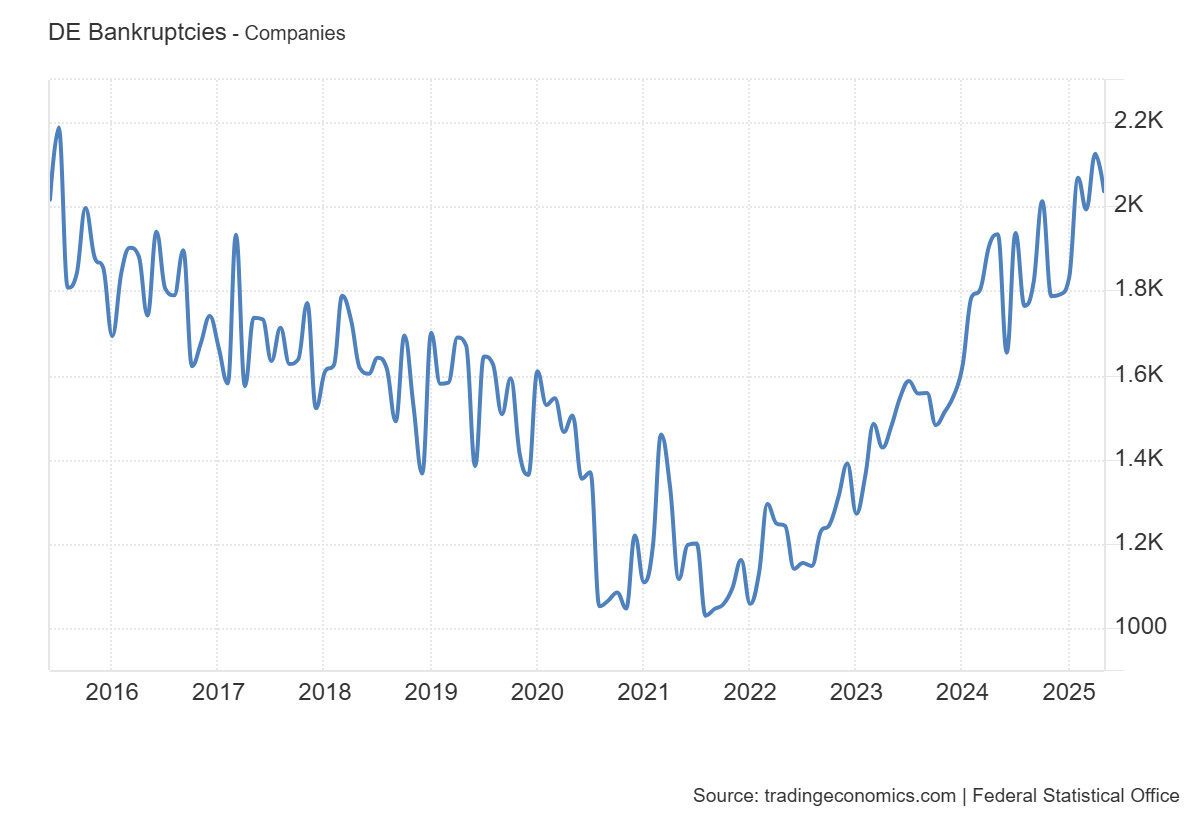 A német gazdaság jelenlegi helyzetét a bizalomhiány, a gyengülő ipari teljesítmény és a munkaerőpiaci feszültségek egyszerre határozzák meg. A vállalatok üzleti várakozásai tartósan alacsonyak, a ZEW és az Ifo mutatói egyaránt azt jelzik, hogy a gazdasági szereplők a bizonytalanság korszakában élnek. A feldolgozóipar és az autógyártás már nem képes visszatérni a korábbi csúcsokhoz, miközben a termelékenység folyamatosan hanyatlik. Ehhez társul a vállalati csődök számának meredek emelkedése, ami a támogatások kivezetése után a strukturális gyengeségeket is felszínre hozta.
