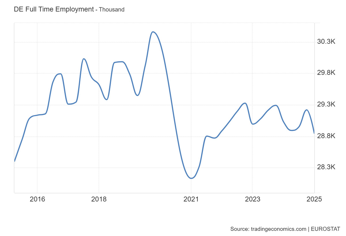 A teljes munkaidős foglalkoztatás a német gazdaság erősségének egyik fokmérője, de ma már kevésbé egyértelmű növekedési pályát követ. Ez arra utal, hogy a gazdaság már nem ugyanazokkal a hajtóerőkkel működik, mint korábban. A jövő munkaerőpiacát inkább a rugalmas foglalkoztatási formák és a minőségi átalakulás határozzák meg, míg a klasszikus, teljes munkaidős állások súlya fokozatosan csökken.
