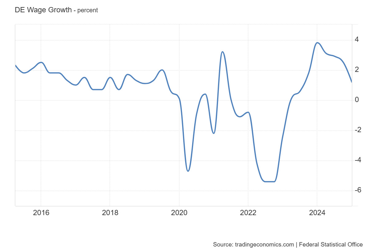A legdrámaibb fordulat 2022–2023-ban következett be, amikor a mutató ismét meredeken negatív tartományba süllyedt, időszakosan megközelítve a –6 százalékot. A reálbérek csökkenése ebben az időszakban példátlan volt az újkori német gazdaságtörténelemben.