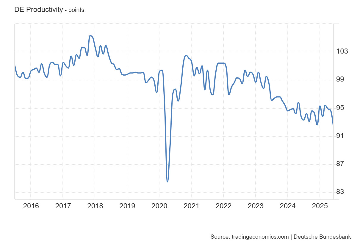 A legutóbbi adatok szerint 2025 elején a mutató 94–95 pont körül ingadozik, vagyis érezhetően alacsonyabb a korábbi csúcsoknál. Ez részben a szerkezeti átalakulásokból ered. Az energiaintenzív iparágak zsugorodása, az ellátási láncok átrendeződése és a digitalizáció lassú adaptációja együttesen húzták lefelé a termelékenységet. A német gazdaság erőssége korábban a magas termelékenység volt, ma viszont éppen ezen a téren mutatkozik a legnagyobb gyengeség.