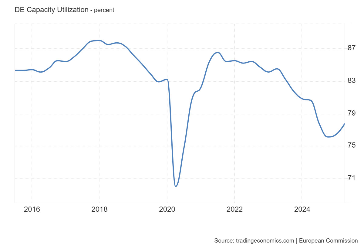 A válságot követő kilábalás gyors volt. 2021-ben a mutató ismét 86 százalék fölé emelkedett, jelezve a kereslet élénkülését és az ipar újbóli lendületét. A fellendülés azonban nem bizonyult tartósnak. 2022-től fokozatos csökkenés indult, amit az energiaválság, az infláció és a nemzetközi kereskedelmi bizonytalanságok együttesen magyaráznak. 2024-re a mutató ismét 76 százalék körülire süllyedt, és bár 2025-ben némi javulás tapasztalható, a szint még mindig elmarad a korábbi évek csúcspontjaitól.