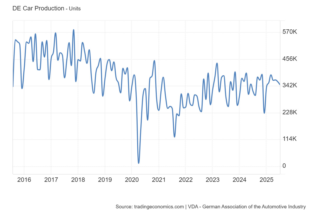 Kevés mutató mesél annyira Németország gazdasági helyzetéről, mint az autógyártás alakulása. Az ábrán jól látható, hogy 2016 és 2018 között a termelés még rendszeresen meghaladta a havi 450 ezer darabot, sőt időnként közel került a félmilliós szinthez is. Ez volt az az időszak, amikor a német autóipar globális keresletre építve tovább erősítette vezető szerepét, és az expororientált gazdasági modell egyik legfontosabb pillérét biztosította.