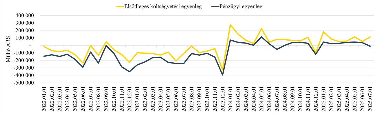 2023 decemberét követően azonban a trend élesen megfordult. Milei hivatalba lépése után a primer egyenleg három hónapot kivéve végig többletet mutatott, a pénzügyi egyenleg pedig csupán három hónapban vett fel negatív értéket. Ez különösen figyelemre méltó eredmény annak fényében, hogy a korábbi hiányok mind az államadósság növekedéséhez járultak hozzá, melyek később a pénzügyi egyenlegben kamatkiadásként jelennek meg. Mindez csak úgy volt elérhető, hogy a központi költségvetés kiadási oldalán jelentős megszorításokat hajtottak végre, amelyek lehetővé tették a pénzügyi egyenleg kedvező alakulását is.