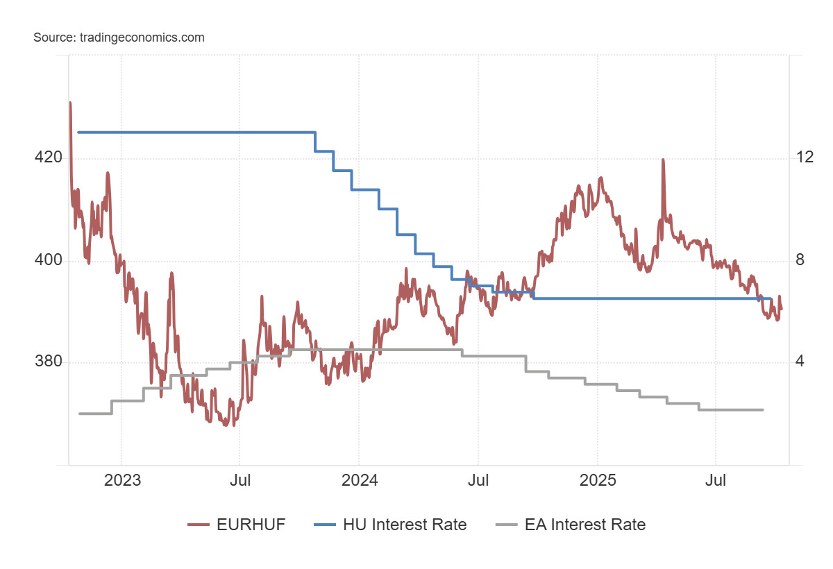 A második felvonásban viszont elkezdett kopni a varázs. Az Európai Központi Bank kamatemelései véget értek, de a Magyar Nemzeti Bank (látva, hogy az infláció lejtmenetbe kapcsolt) fokozatosan csökkentette az alapkamatot. A magyar kamatfelár előbb 8, majd 4, végül 2,5 százalékra olvadt. És eközben valami megváltozott. A forint, amely addig önbizalommal feszített, hirtelen gyengülni kezdett. A befektetők ugyanis már nem látták benne azt a nagy hozamígéretet, amit korábban megkaptak.