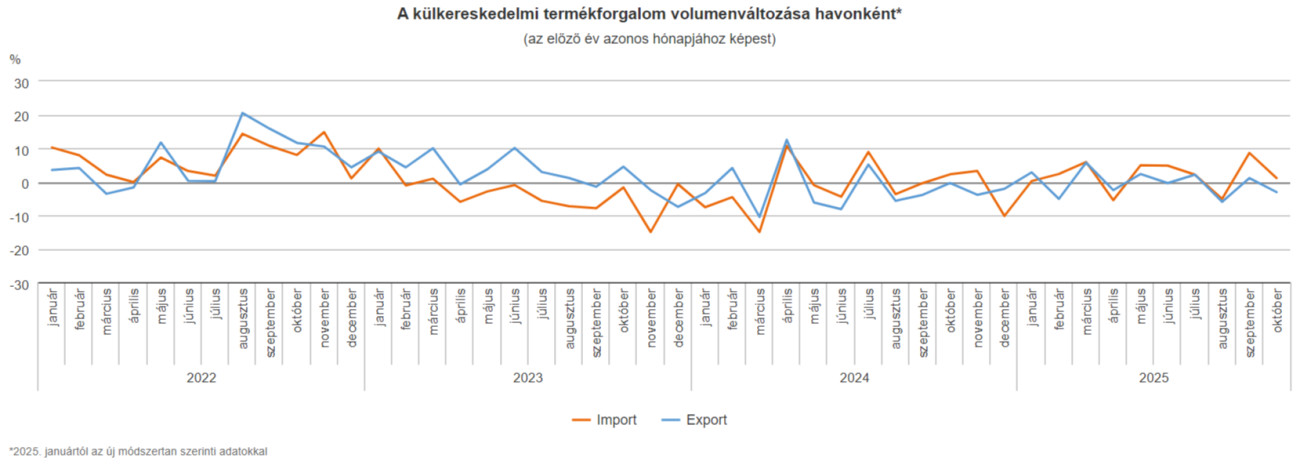 Az export szezonálisan és munkanappal kiigazított volumene 1,4 százalékkal, az importé pedig 3,6 százalékkal maradt el a szeptemberitől.