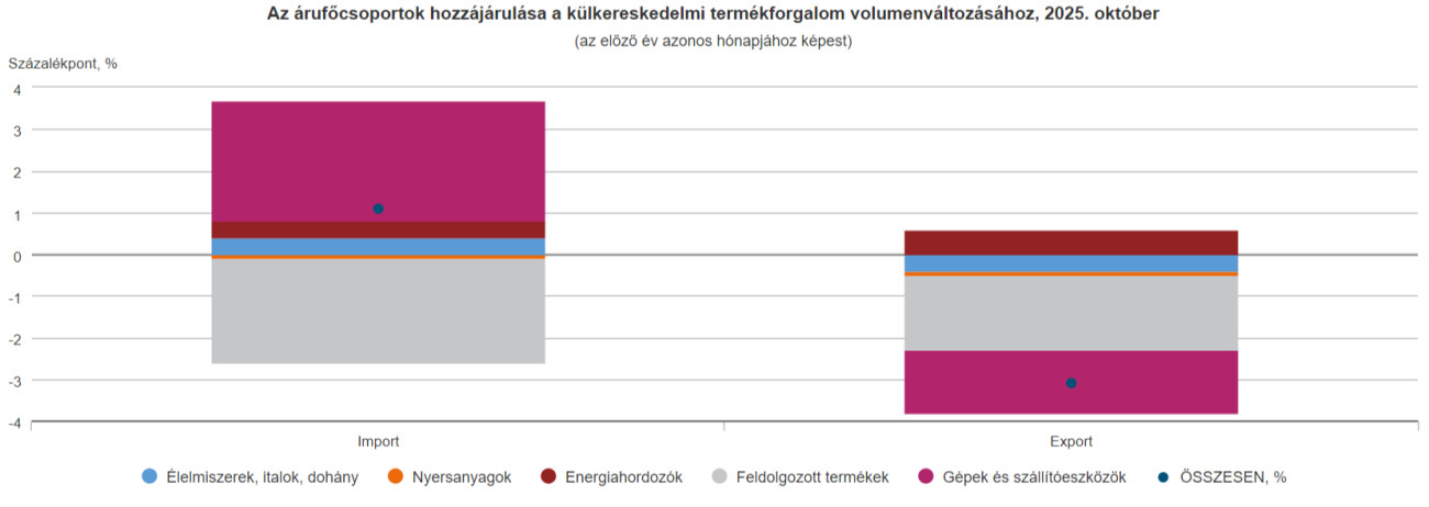 A KSH jelentése szerint a gépek és szállítóeszközök exportvolumene 2,6 százalékkal csökkent, importvolumene 6,4 százalékkal bővült. A gépek és szállítóeszközök árufőcsoport a kiviteli oldalon 1,5 százalékponttal fokozta a teljes export volumencsökkenését, a behozatalban 2,9 százalékponttal erősítette a teljes import volumennövekedését.