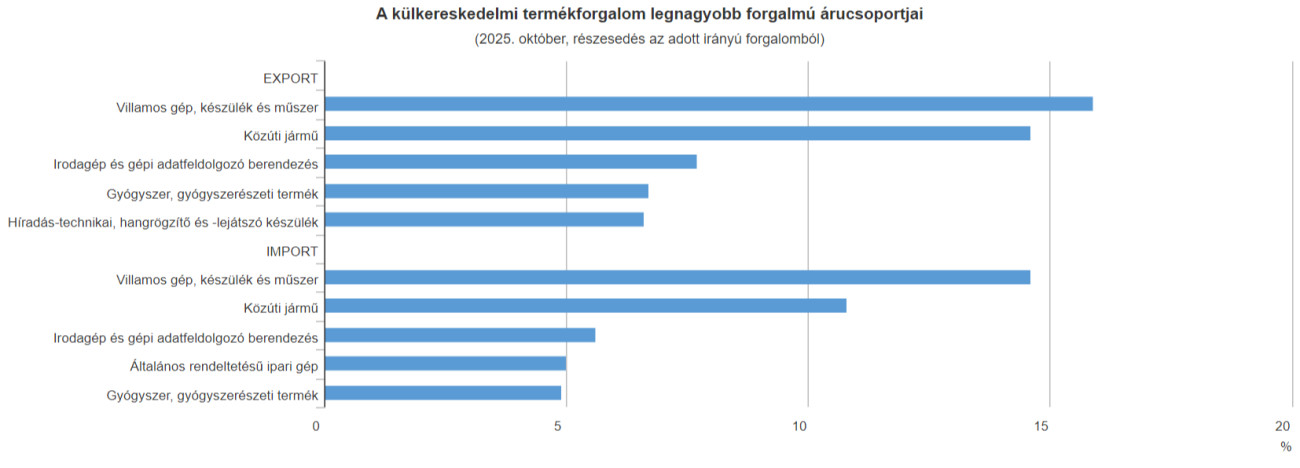 Októberben a kivitel értéke 12,8 milliárd euró (5010 milliárd forint), a behozatalé 12,1 milliárd euró (4732 milliárd forint) volt. Az egy évvel korábbi időszakhoz képest euróban kifejezve az export értéke 0,9 százalékkal csökkent, az importé 0,6 százalékkal nőtt.