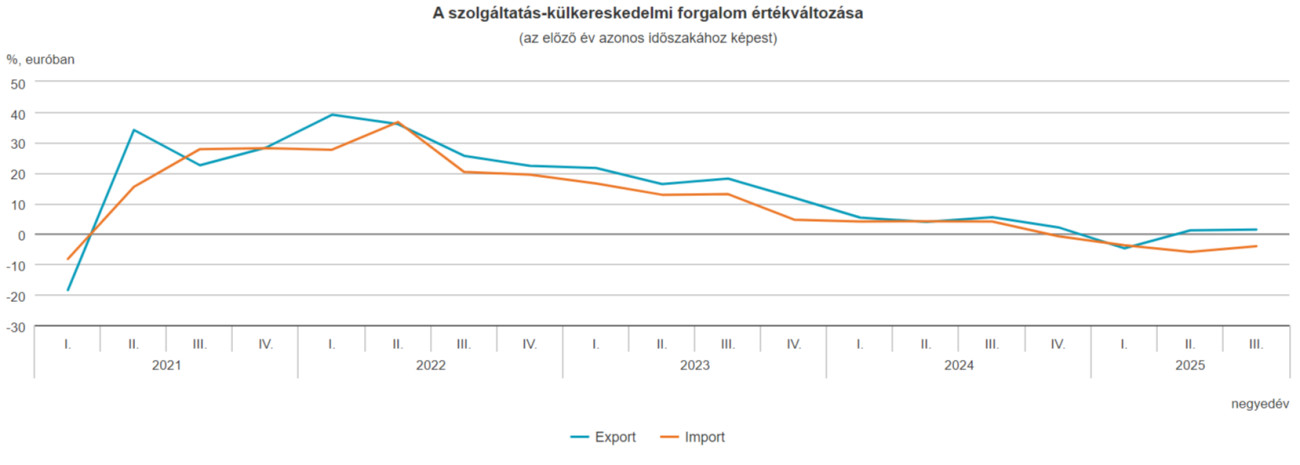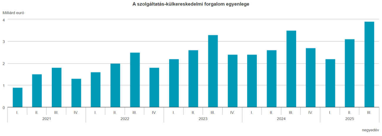 A Központi Statisztikai Hivatal hétfőn azt is közölte, hogy 2025 harmadik negyedévében a szolgáltatások euróban számított exportja 1,4 százalékkal bővült, importja 4,1 százalékkal mérséklődött az előző év azonos időszakihoz képest. Az aktívum 3,9 milliárd euró volt, 415 millió euróval több a 2024. harmadik negyedévinél.