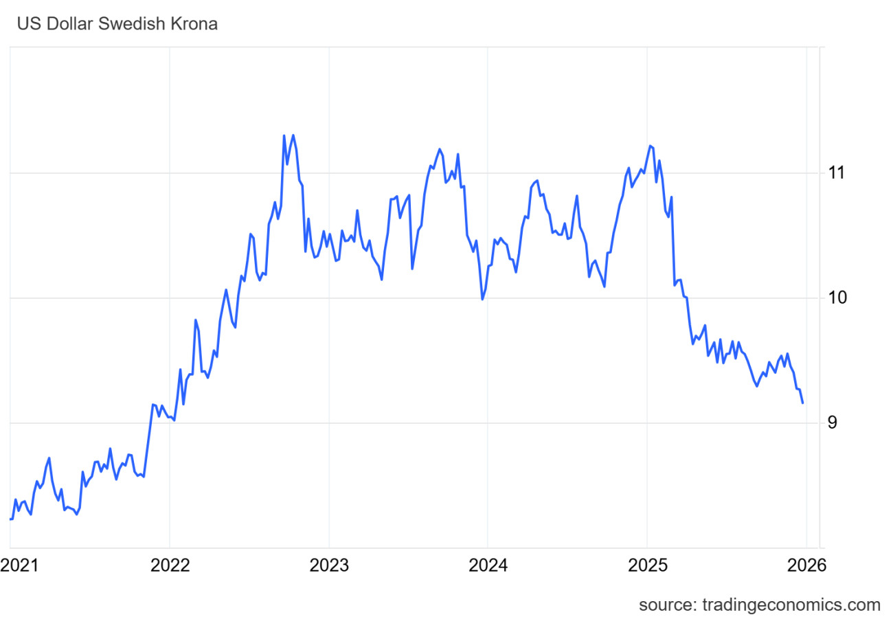 A svéd korona története az orosznak szinte az ellentéte. Itt nem rendkívüli kamatok adták az erőt (a jegybanki alapkamat 2,5 százalékról 1,75-re csökkent 2025-ben), hanem a hitelesség. Az infláció az év nagy részében 1 százalék alatti értéket mutatott, ami csökkentette a bizonytalanságot a jövőbeni monetáris pályát illetően.