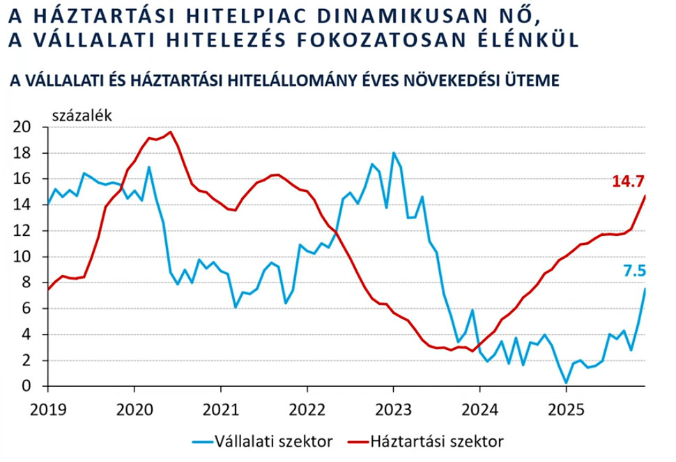 Ami a hitelezést illeti, a vállalati és a háztartási hitelezés hónapok óta kimagasló számokat produkál, ebben jelentős szerepe van az Otthon Start fix 3 százalékos hitelének.