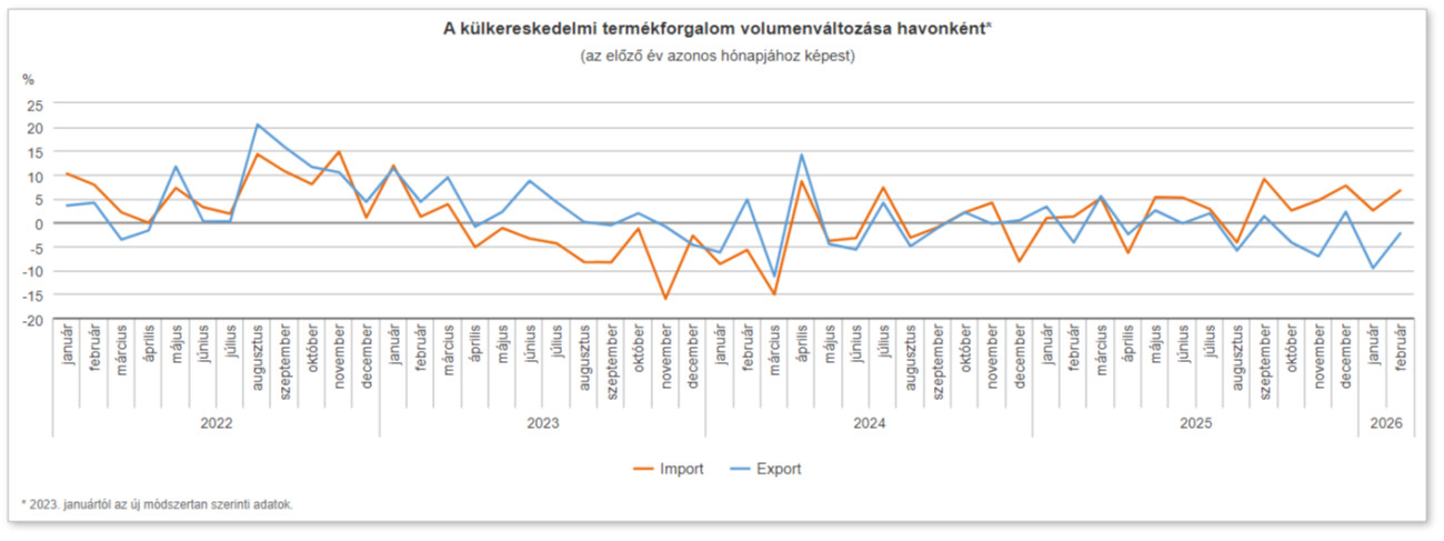 Az export szezonálisan és munkanappal kiigazított volumene 2,6 százalékkal, az importé 1,2 százalékkal meghaladta a januárit.