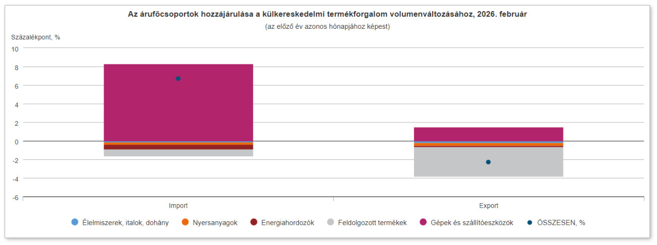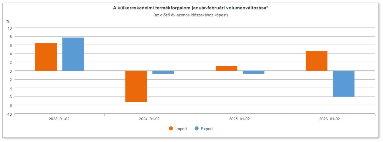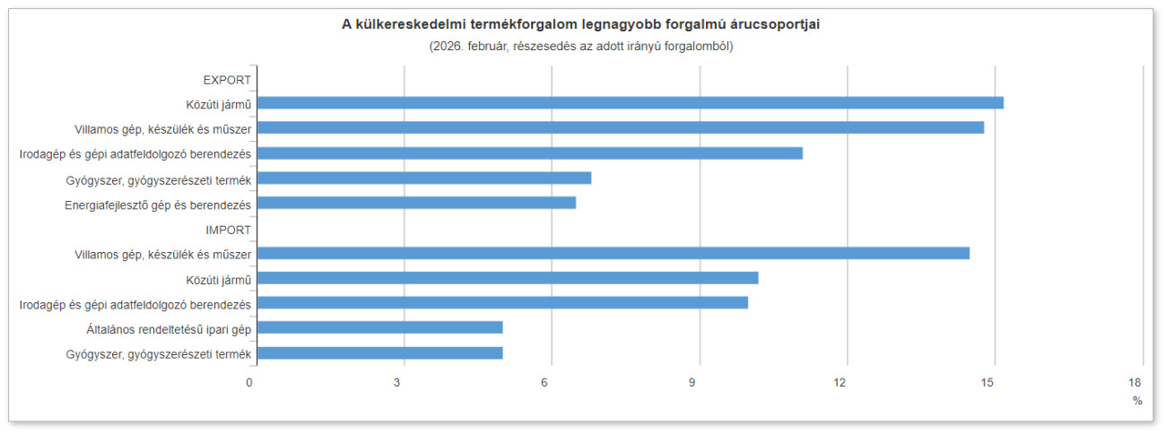 A jelentés ismertette: az EU tagállamaiba irányuló kivitel volumene 3,4 százalékkal, az onnan érkező behozatalé 0,4 százalékkal csökkent. A termék-külkereskedelmi mérleg 29 millió euróval javult a 2025. februárihoz képest, így 1279 millió eurós aktívum keletkezett. Az export 74 százalékát, az import 67 százalékát bonyolította le Magyarország ebben a viszonylatban.