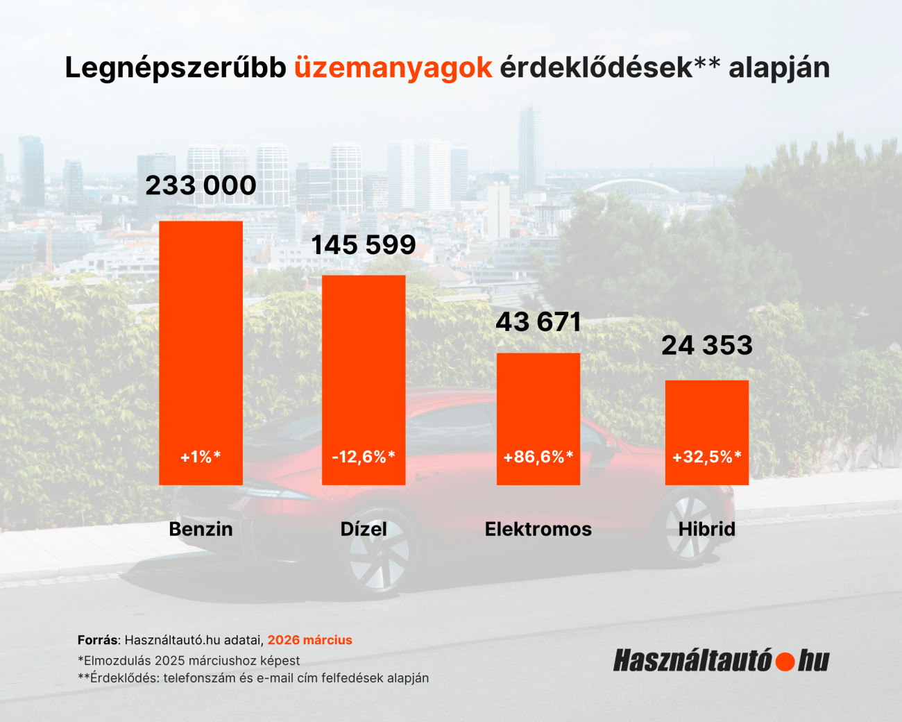 Az üzletágvezető hozzátette: bár még mindig a hagyományos hajtásláncú (benzines vagy dízeles) autók a legnépszerűbbek, most már egyértelműen ki lehet jelenteni, hogy az elektromos és hibrid járművek is egyre keresettebbek. Koralewsky Márk elmondta: 2026 márciusában a benzines autók 233 ezer, míg a dízelesek nagyjából 145 ezer érdeklődést generáltak az oldalon. Komoly fordulatnak nevezte, hogy