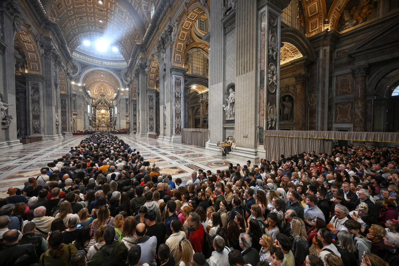A sorba a Szent Péter téren lehetett beállni, ahova csak többszörös biztonsági ellenőrzés után lehetett eljutni. A bazilikába a jubileumra megnyitott szent kapun lehet bejutni, a pápa nyitott koporsója a főoltár előtt áll. A 11 órai kezdésre mintegy 20 ezren gyűltek össze a téren: egyháziak és gyerekes családok, rómaiak és zászlókat lengető argentinok. Többen rosszul lettek a melegben, rajtuk a tér közelében állomásozó mentősök segítettek.