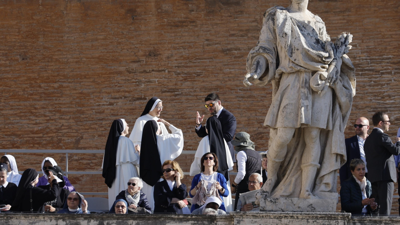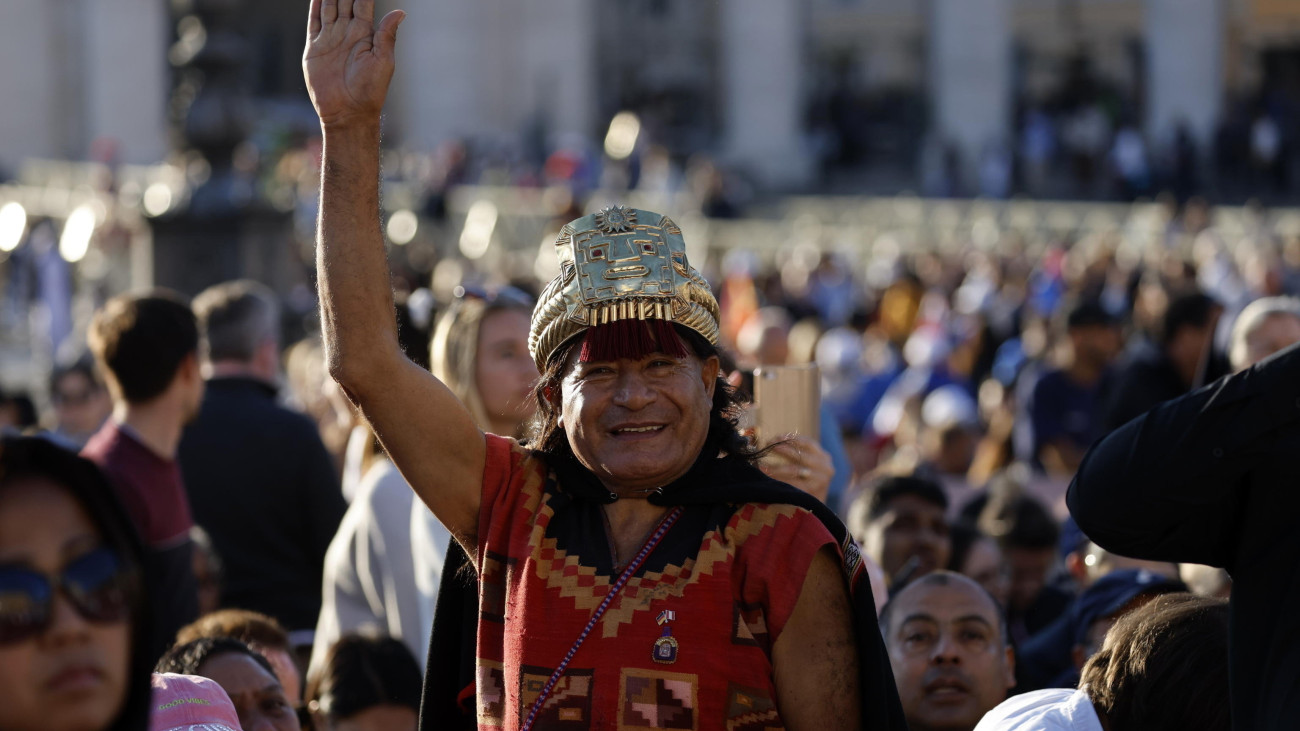 Vatikánváros, 2025. május 18. Perui népviseletbe öltözött, inka fejdíszt viselő férfi a vatikáni Szent Péter téren 2025. május 18-án, amikor XIV. Leó pápa megkezdi péteri szolgálatát. Robert Francis Prevost amerikai bíborost május 8-án választották meg a római katolikus egyház 267. vezetőjének az április 21-én, 88 éves korában elhunyt Ferenc pápa utódjául. A 69 éves Prevost az első amerikai pápa az egyház történetében. MTI/EPA/ANSA/Fabio Frustaci
