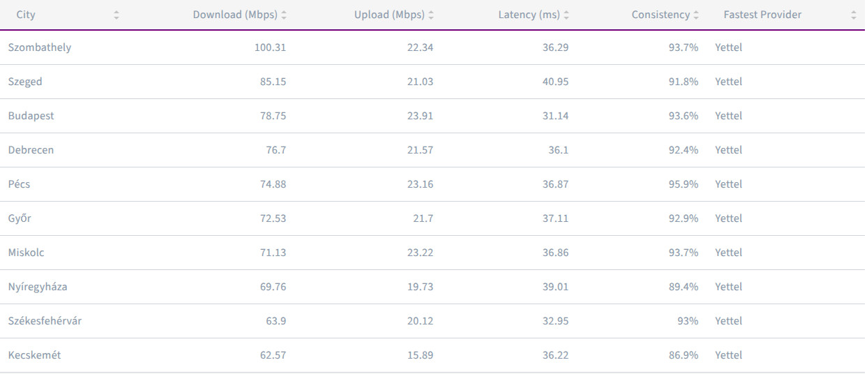 Otthoni internet tekintetében Miskolc hozta a legjobb mediánadatot (229,89/80,48 Mbps), a fővárost (222,42/40,42 Mbps) és Székesfehérvárt (212,59/39,12 Mbps) megelőzve. A leggyorsabb szolgáltató terén már nagyobb verseny alakult ki: a Magyar Telekom vezetett, de bizonyos helyeken a DIGI és a Vodafone is győzni tudott – igaz, utóbbi két cég már egyesült One néven.